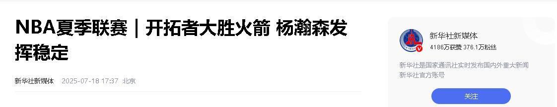 信源:新华社新媒体 2025 07 18 NBA夏季联赛|开拓者大胜火箭 杨瀚森发挥稳定国际在线 2025 07 17 美媒热议杨瀚森NBA夏季联赛出色表现 网友称开拓者捡了“大漏”!